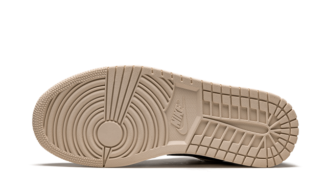 The 1 Low Black Guava Ice's upper is made from premium leather and synthetic materials, featuring a black and gray base, with soft accents in Guava Ice — a shade of light pink with hints of peach, which adds a subtle and refreshing contrast to the design. The Guava Ice appears mainly on the swoosh and around the collar, bringing a touch of color that brings the model to life without losing its elegance.